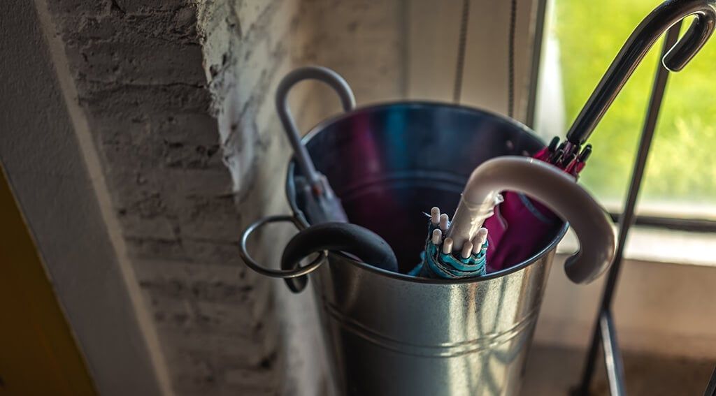A dripping umbrella left next to muddy shoes at the front door can cause bad smells and a wet floor. To prevent this, place an umbrella stand by your front door to spare your floor from getting wet as you enter your home.